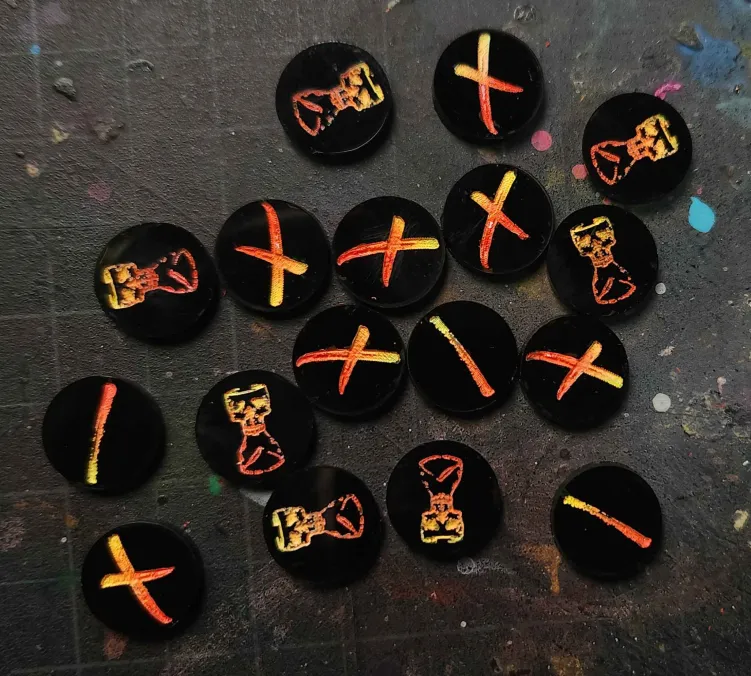 Take your Warcry battles to the next level with these premium acrylic tokens. Designed for durability and ease of use. These tokens help you track Reacted, Activation, and Wait status with ease. Their dual-sided design ensures smooth gameplay while keeping your tokens distinct from your opponent’s. These tokens are made in America with high-quality 3mm acrylic. They are one of a kind original 2 Bottles Emporium Design. 19mm size for easy handling and visibility. Tokens come blank un-color filled and can be color filled to match your design and team style. These tokens are just the essentials to enhance your game and set your markers apart, objective markers not available at this time. Upgrade your Warcry experience today!